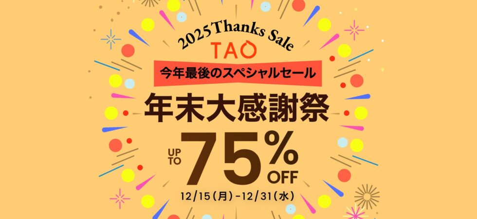 アリババグループ傘下のAlibaba International Digital Commerce Groupが運営する越境ECアプリ「TAO(タオ)」は、2025年12月15日(月)00:00~12月31日(水)23:59:59の期間中、今年最後のスペシャルセール「2025 Thanks Sale」を開催します。本セールは、ユーザーの日頃のご愛顧にお応えする年末の大感謝祭です。最大75%OFFでご提供するこの機会に、今年最後のお買い物をお楽しみください。