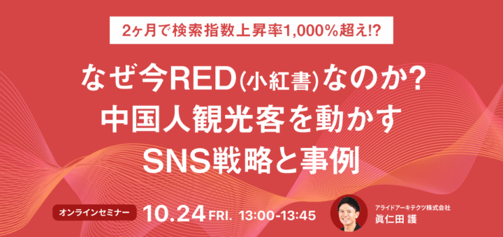 データとクリエイティブの力でマーケティングコミュケーションを設計し、企業のマーケティングAXを支援するアライドアーキテクツ株式会社(本社:東京都渋谷区、取締役社長:村岡弥真人、証券コード:6081、以下「当社」)は、10月24日(金)に無料オンラインセミナー「2ヶ月で検索指数上昇率1,000%超え!?なぜ今RED(小紅書)なのか?中国人観光客を動かすSNS戦略と事例」を開催いたします。