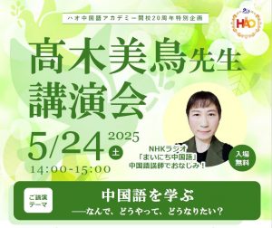 株式会社イーオン(本社:東京都新宿区、代表取締役社長:重野卓、以下「イーオン」)が運営するハオ中国語アカデミーは、開校20周年を記念し、NHKラジオ「まいにち中国語」などでおなじみの髙木美鳥(たかぎ・みどり)先生をお招きし、特別講演会を開催いたします。