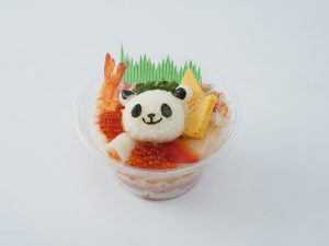 双子パンダをのせた、華やかな海鮮ちらし寿司。