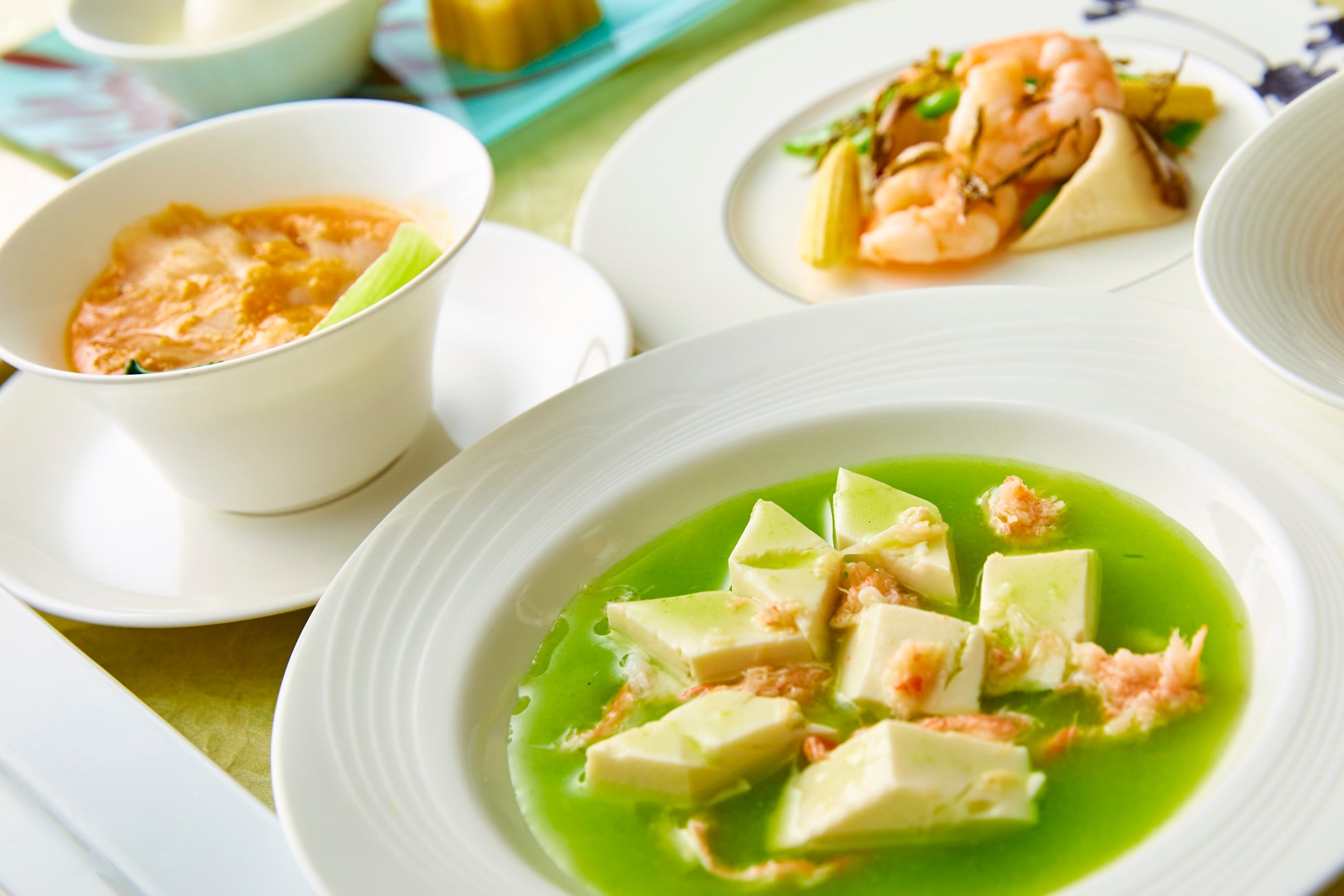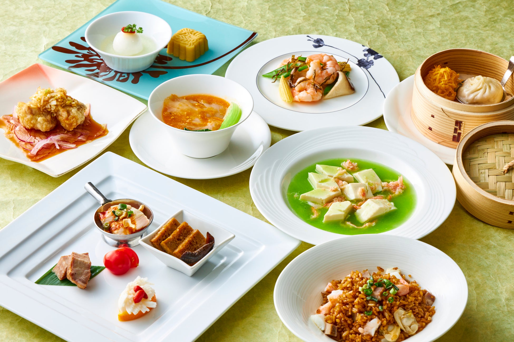 上海蟹味噌が入ったふかひれ姿煮スープや中国を代表する「龍井茶」の茶葉を使用した炒め物など見た目も味も楽しめる初夏のランチタイムにふさわしいコースです。