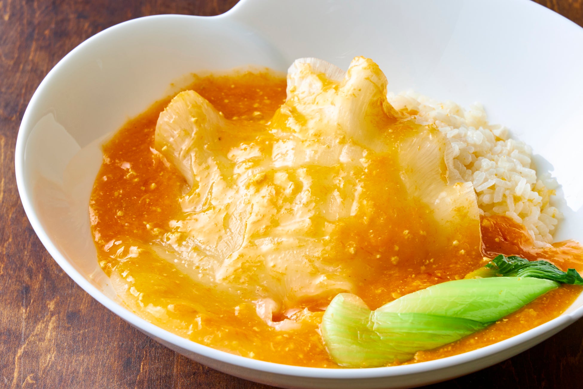 気仙沼産吉切鮫の胸ヒレを1枚姿のまま、上海蟹味噌と煮込んだボリュームがあり卵炒飯の上にあんかけをのせた贅沢な逸品。