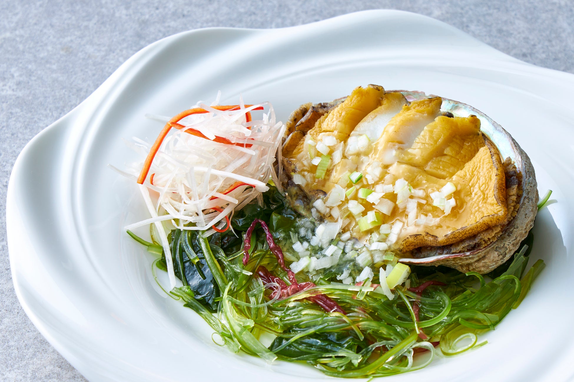 蝦夷鮑まるごと1個を蒸し上げました。塩をベースにした葱生姜ソースでお召上がりください。