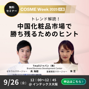 天猫国際日本(Tmallジャパン)は、2025年9月24日から26日にかけて、大阪で開催される「COSMEWeek2025大阪」(主催者:RX Japan)に出展いたします。出展期間中、天猫国際はセミナーに登壇し、「中国コスメ市場のトレンドと越境EC市場の新たな戦略」をテーマに特別講演を行う予定です。中国消費者の行動変化を詳細に分析するとともに、海外ブランドの中国市場進出における最適なソリューションをご紹介いたします。