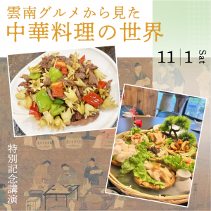 多民族が暮らす中国雲南省は、豊かな自然と多彩な食文化に恵まれた地域です。本講演では、過橋米線(グオチャオミーシエン)や野生キノコ、プーアル茶など、個性あふれる雲南グルメから、中華料理の多様性や地域性、また、歴史的背景をひもときます。ひとつの料理から広がる「食」の世界を通じて、中国文化への理解を深めてみませんか。