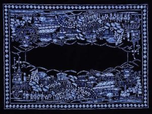 「京都の祭を描いた白族の絞り染め」