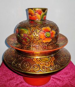雲南発の伝統銅工芸品で、銅に文様を彫り、銀や金を流し込み磨き上げることで黒と銀・金の鮮やかなコントラストを生み出します。起源は清代雍正年間(18世紀前半)で、文房具や酒器、茶器などが制作されました。職人の体質と素材の相性により美しい色を出すこの技法は、国家級無形文化遺産に登録され、運命と才能が生み出す美の結晶として今も輝きを放っています。