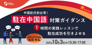 グローバル⼈材育成・研修業を⼿掛けるインサイトアカデミー株式会社(本社:東京都港区新橋、代表:金 珍燮)は、無料webセミナー「【中国赴任前必見!】”駐在中国語” 対策ガイダンス~1時間の実践レッスンで、駐在成功を引きよせる~」を開催致します。
