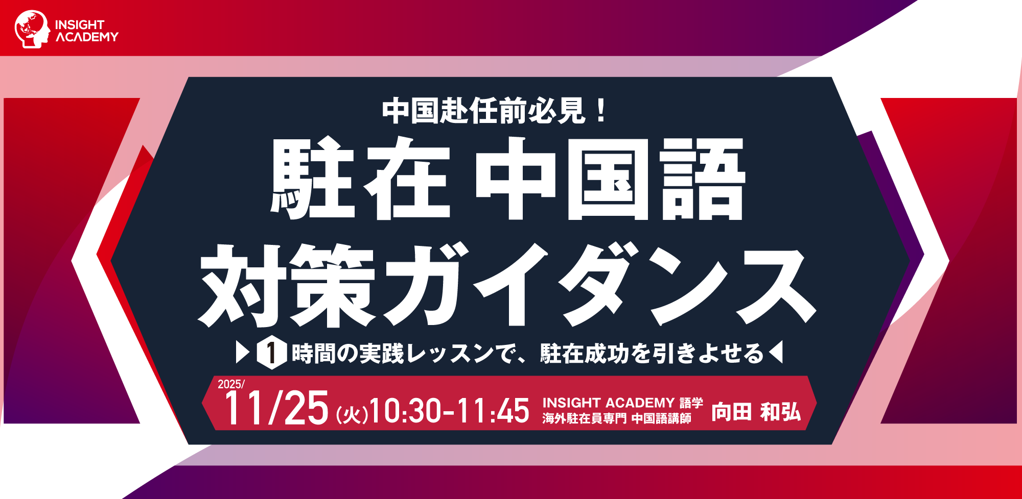 グローバル⼈材育成・研修業を⼿掛けるインサイトアカデミー株式会社(本社:東京都港区新橋、代表:金 珍燮)は、無料webセミナー「【中国赴任前必見!】”駐在中国語” 対策ガイダンス~1時間の実践レッスンで、駐在成功を引きよせる~」を開催致します。