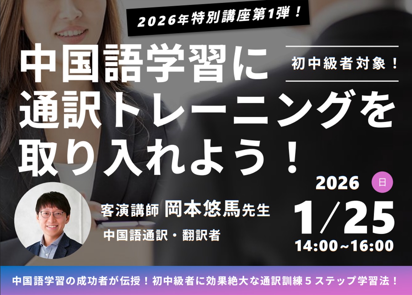 講師には中国語通訳・翻訳者としてご活躍されている岡本悠馬氏をお招きし、ご自身の通訳学習法をご紹介いただきながら、「クイックレスポンス」や「リテンション」などの5つの通訳トレーニングを初中級者向けに実践・指導していただきます。「さらに上を目指したい」と考える初中級者が、それぞれの学習法を確立するのに役立つ講座となっています。