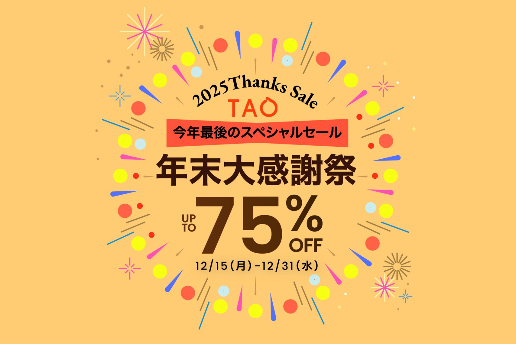 アリババグループ傘下のAlibaba International Digital Commerce Groupが運営する越境ECアプリ「TAO(タオ)」は、2025年12月15日(月)00:00~12月31日(水)23:59:59の期間中、今年最後のスペシャルセール「2025 Thanks Sale」を開催します。本セールは、ユーザーの日頃のご愛顧にお応えする年末の大感謝祭です。最大75%OFFでご提供するこの機会に、今年最後のお買い物をお楽しみください。