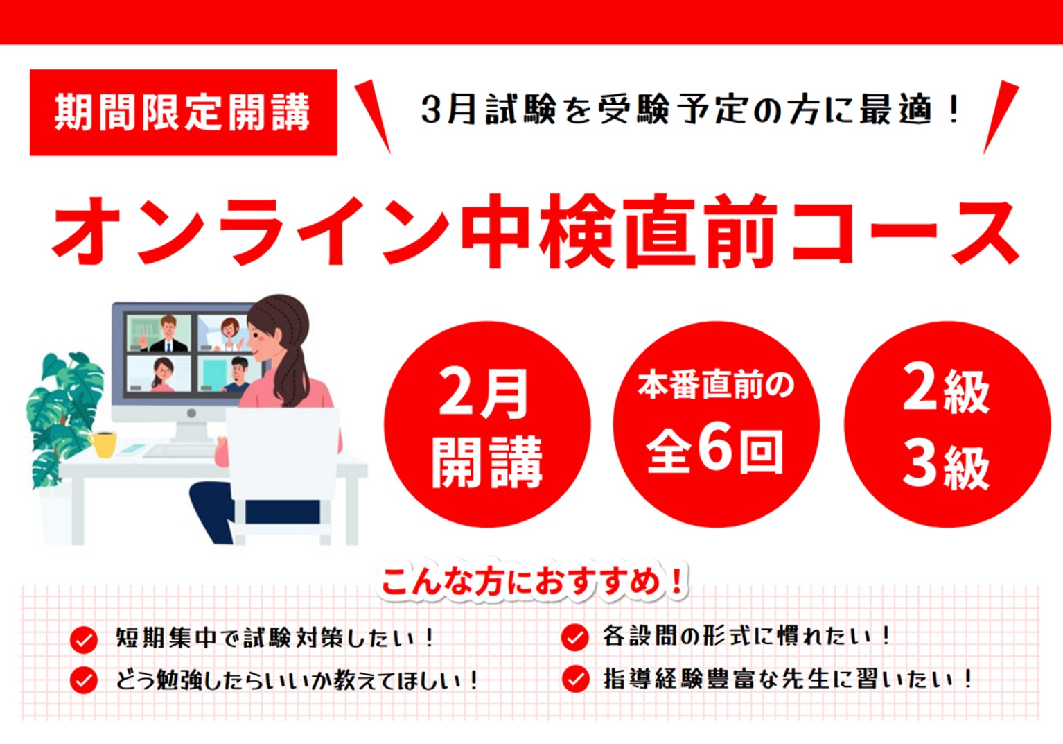 | 講座名 | オンライン中検直前コース(2級・3級対策) |
