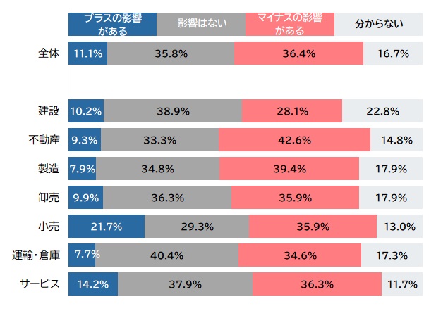 今後半年程度の影響では、中国人留学生などによる賃貸需要や、マンション購入需要の減少が懸念される『不動産』の42.6%が「マイナスの影響」を見込んでおり、主要7業界のなかで唯一、今後のマイナス影響が現在の割合を上回った。他方、「プラスの影響がある」割合は、『小売』で21.7%に上昇し、全体を10ポイント以上上回った。