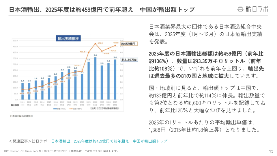 - 日本酒輸出、2025年度は約459億円で前年超え 中国が輸出額トップ