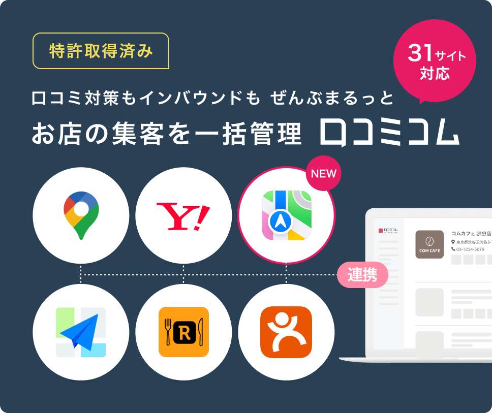 口コミコムは、国内外の口コミサイトを“もっと”売上に変える「店舗向け集客一元化プラットフォーム」です。