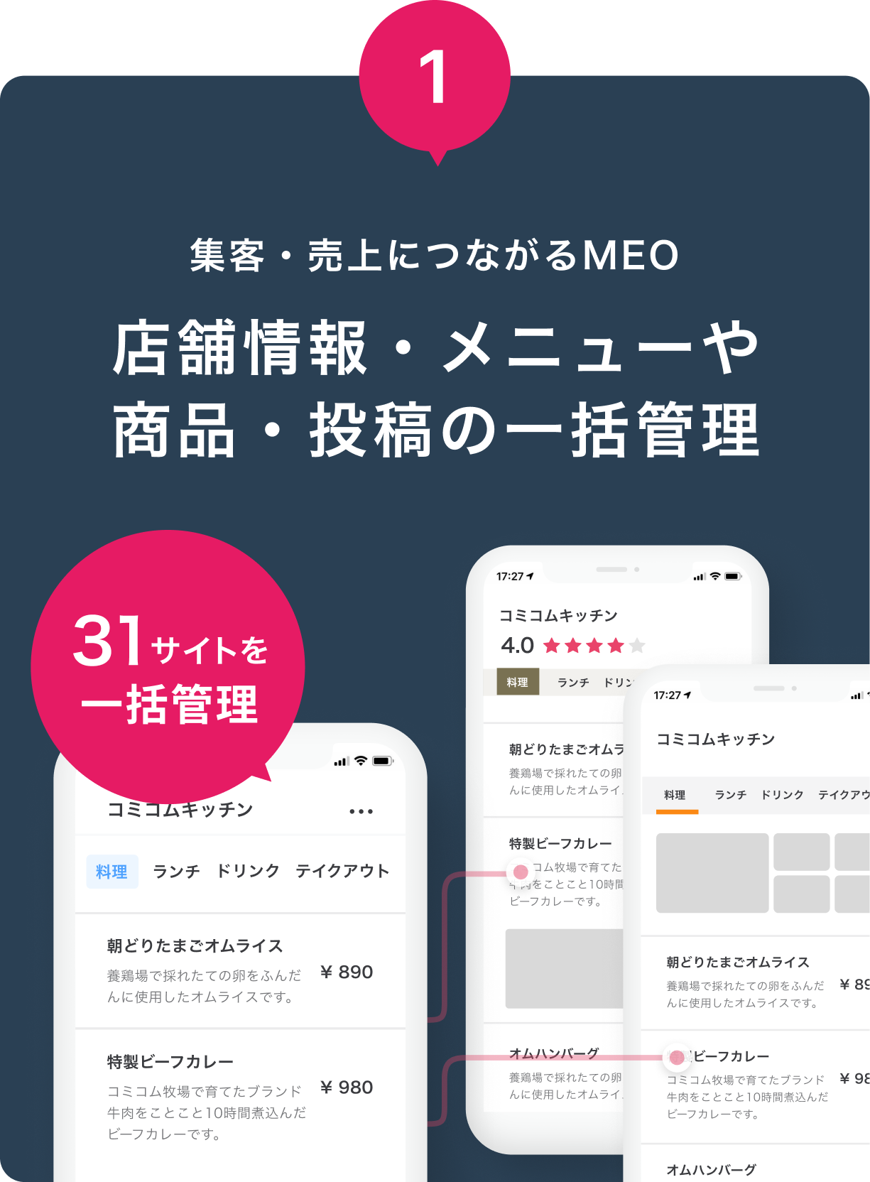 自社HPを含む32サイトと連携!店舗情報・メニューや商品・投稿を一括管理