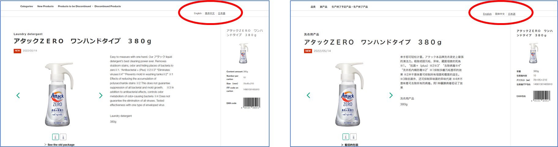 そしてこのたび、日本語以外の言語を主に使って生活する方や、日本を訪れた海外の方に花王商品の特徴を理解し、不安なく使ってもらえることをめざし、日本語の「製品カタログ」(化粧品を除く)の画面から英語と中国語(簡体字)で表示されるページを案内する機能を、本格的に稼働させました。