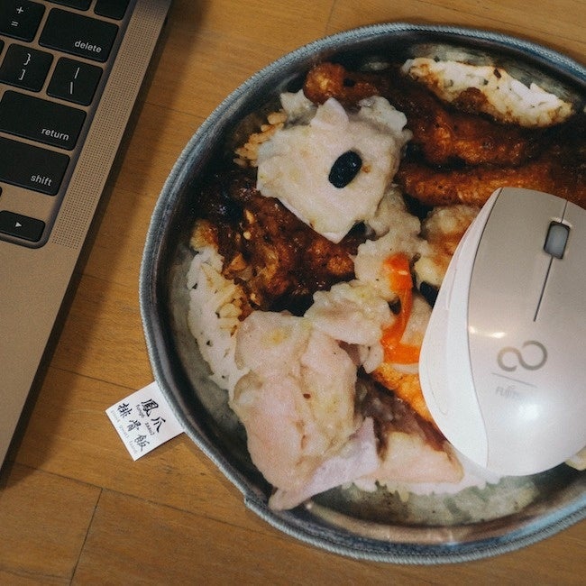 思わず二度見してしまうインパクト大のマウスパッドは、「鳳爪排骨飯」という鶏足と骨付き肉のごはんをモチーフにしたもの。他の香港グルメバージョンも多数。本物さながらの見た目で、仕事中にお腹が鳴ってしまいそう。
