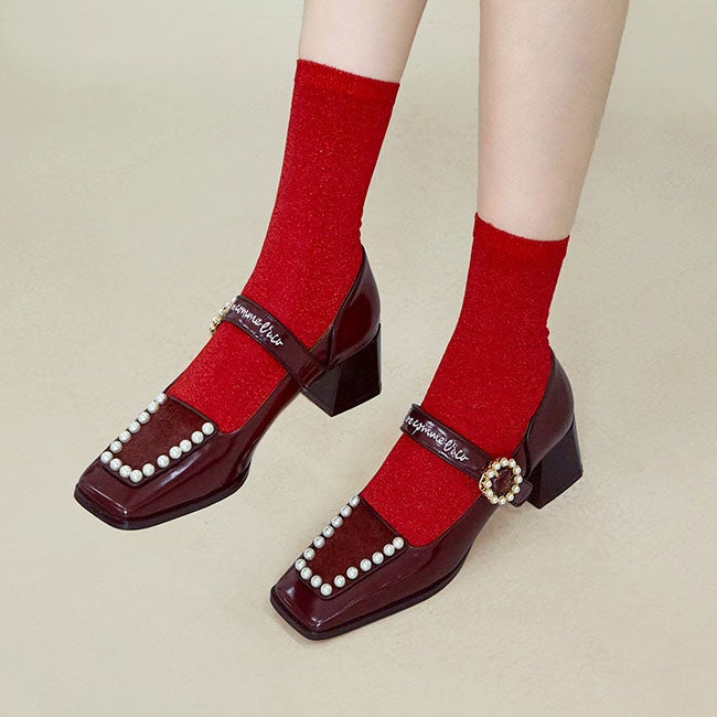レトロながらもエレガントさを見せてくれるスクエアトゥのメリージェーン。パールが華やかな印象を与えてくれます。秋冬のコーディネートにもマッチしそうなカラーが揃っています。
