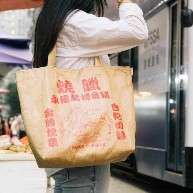 描かれているのは、鶏や豚をローストした香港のソウルフード、焼味(シュウメイ)。ビニール袋が普及する70年代頃までは、茶色の紙袋が主流だった香港。防水性のある素材で、当時のレトロな紙袋を忠実に再現しています。