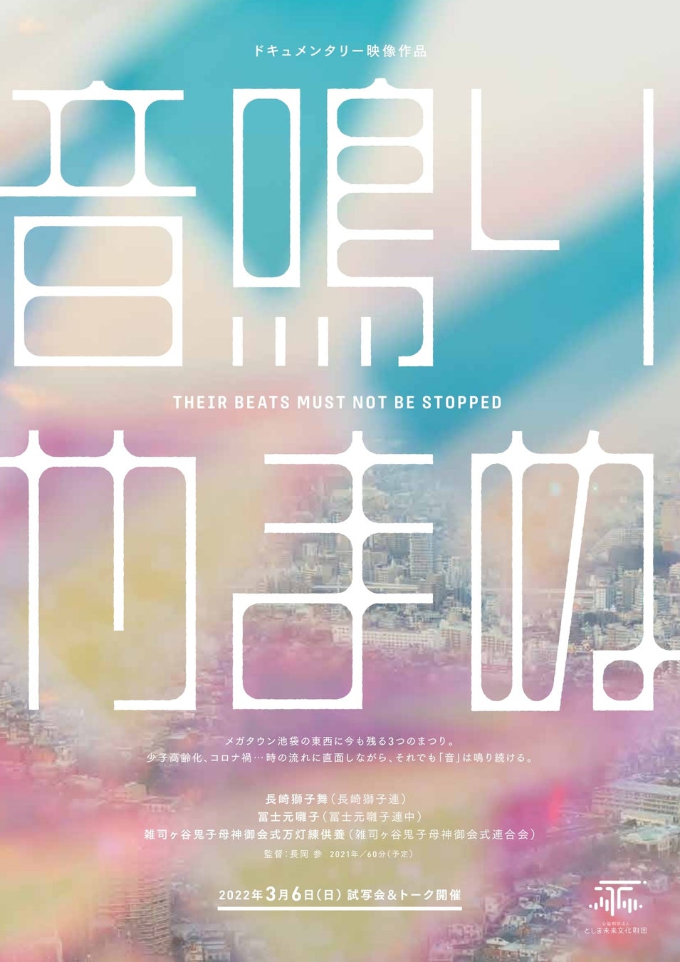 公益財団法人としま未来文化財団(所在地:東京都豊島区、理事長:高野之夫)は、豊島区指定無形民俗文化財「長崎獅子舞」「冨士元囃子」「雑司ヶ谷鬼子母神御会式万灯練供養」の現在を追ったドキュメンタリー映像作品『音、鳴りやまぬ。』を制作しました。2022年3月6日(日)に、としま区民センター多目的ホール(住所:豊島区東池袋1-20-10)にて試写会&トークを開催、本編を初公開します。