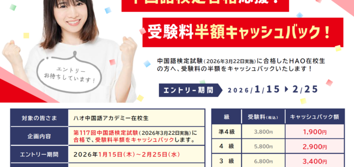 株式会社イーオン(本社:東京都新宿区、代表取締役社長:重野卓、以下「イーオン」)が運営するハオ中国語アカデミーは、在校生の中国語学習の成果を試す機会を広げ、学習継続へのモチベーション向上を目的として、「中国語検定合格応援!受験料半額キャッシュバック企画」を実施いたします。